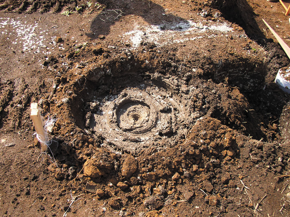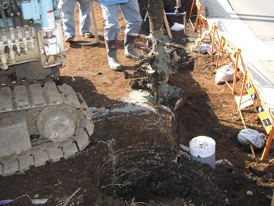 掘削機械で掘削しながらセメント系固化材を注入し、地中に柱を造ります。